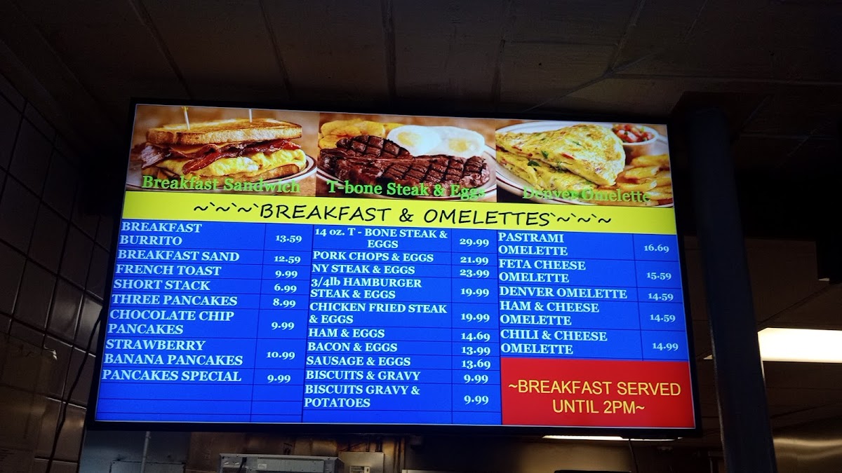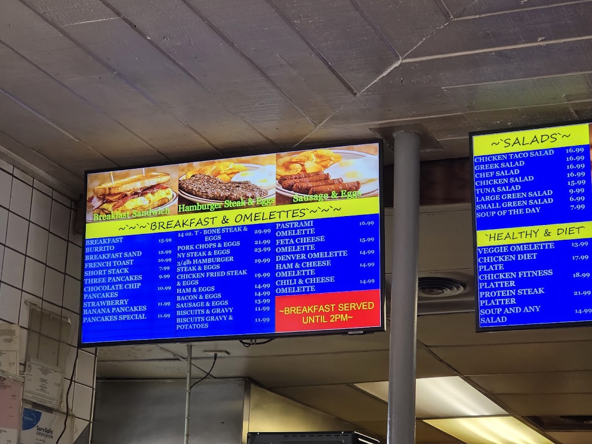 The menu offers a variety of options primarily centered around classic American fare with a focus on hamburgers, sandwiches, and breakfast items. It is structured into key groups including burgers and specials, healthy and diet-conscious dishes, beverages, and sides such as fries and other accompaniments.