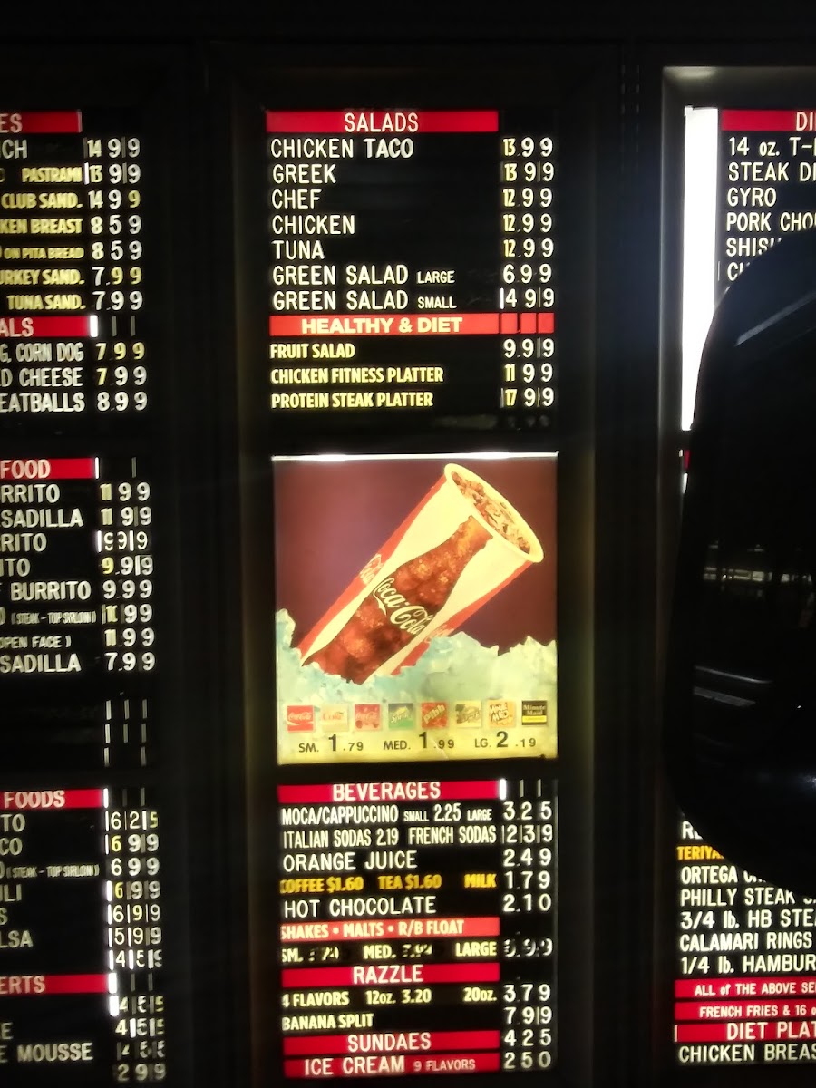 For beverages, the menu includes coffee, hot chocolate, a variety of soda flavors available via a Coca Cola freestyle machine, root beer floats, juices, and milkshakes or malt shakes in traditional flavors such as chocolate, vanilla, strawberry, and banana.